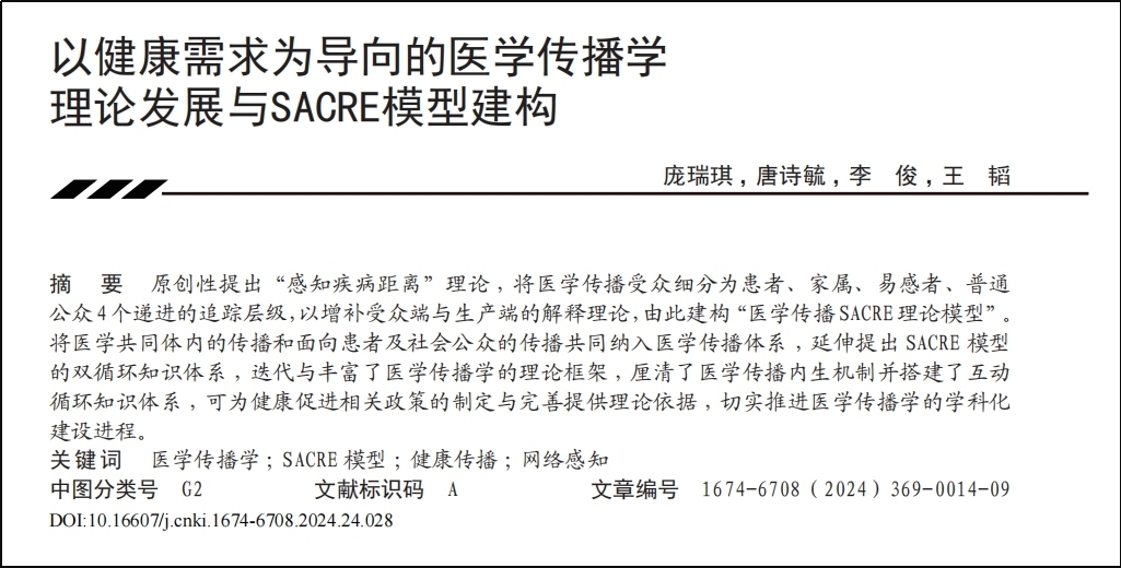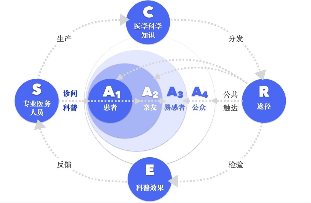 2024年12月,由中国科学时间协会期骗、中国科技新闻学会主理的《科技传播》杂志发表了王韬团队的论文《以健康需求为导向的医学传播学表面发展与SACRE模子建构》,初度系统冷落医学传播学SACRE模子:也等于由专科医务东谈主员(Scientific subjects,S)手脚医学传播收罗中的科学性主体,分娩、传播和把关传播内容的科学性;患者(A1)、支属(A2)、易感者(A3)和公众(A4)嵌套构成的四级科普对象(Audience,A)是科普内容的收受者;科学性主体(S)凭证场景聘用符合的传播路子(Route,R),将医学科普内容(Clinic Content,C)分发触达不同受众(A),并磨练科普成果(Effect,E)。SACRE模子的冷落极地面丰富和完善了当代医学传播学学科内涵。