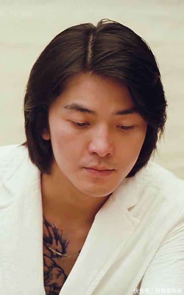 郑伊健身穿玄色渐变外衣,长发被汗水打湿贴在脸上。