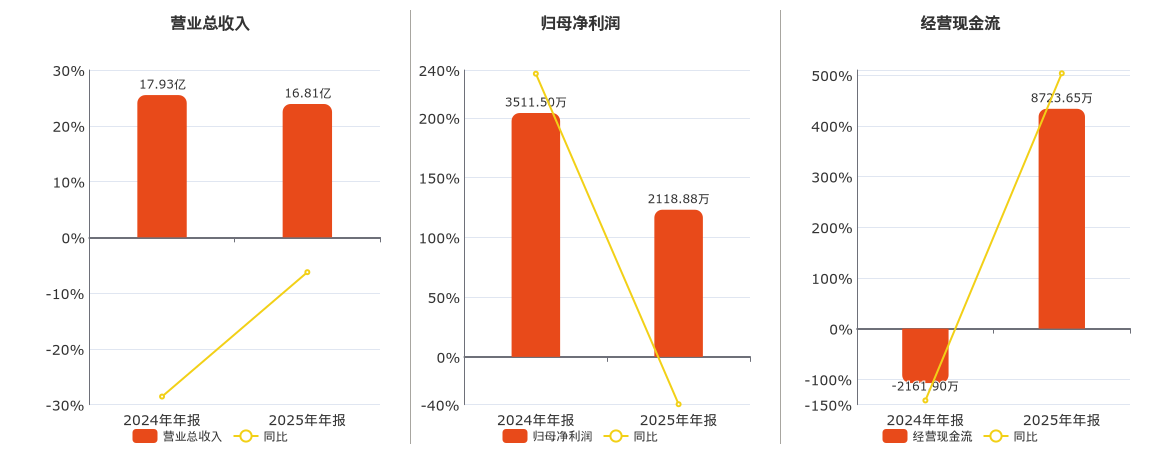 公司买卖总收入为16.81亿元,较昨年同敷陈期买卖总收入减少1.12亿元,同相比昨年同时下落6.25%。归母净利润为2118.88万元,较昨年同敷陈期归母净利润减少1392.62万元,同相比昨年同时下落39.66%。方针动作现款净流入为8723.65万元。